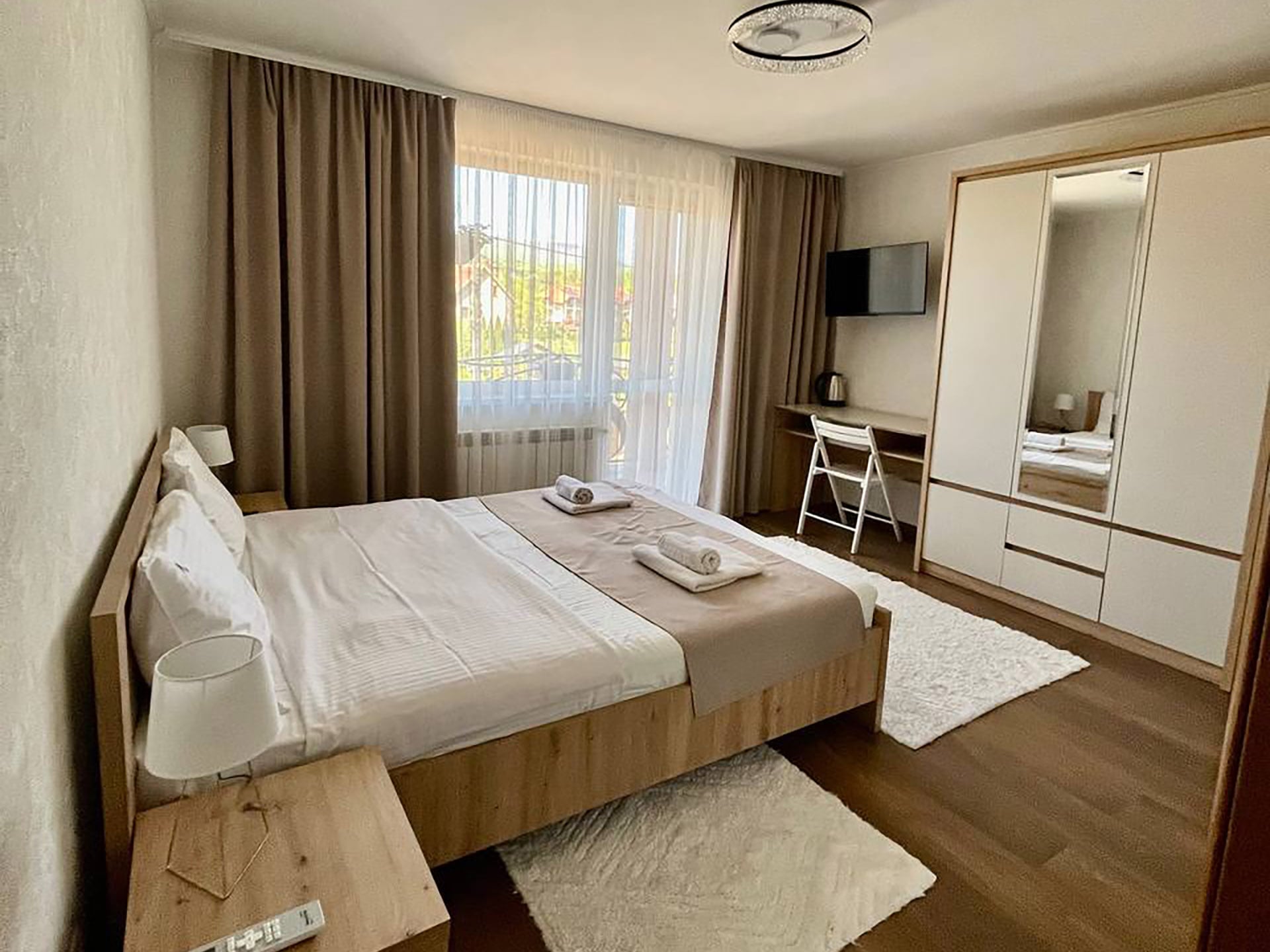 Пориньте в атмосферу справжнього карпатського затишку з двомісним стандартним номером у Садибі Ярослава, що розташована в мальовничому Закарпатті! Цей номер – ідеальний вибір для двох друзів, сімейної подорожі чи тих, хто шукає комфорт і спокій серед природи. Простора кімната облаштована двоспальним ліжком з ортопедичним матрацом, що гарантують міцний сон після дня, наповненого пригодами. Сучасні дерев’яні меблі, теплі тони інтер’єру та дбайливо підібраний декор створюють відчуття домашнього тепла, а великі вікна відкривають захоплюючий краєвид на величні Карпати, де кожен ранок починається з краси гір і свіжого повітря.